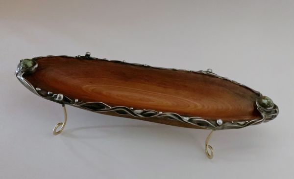 geschnitzt aus heimischem Holz gefaßt in Zinn und Kupfer Applikation Pauamuschel und Ammonit Messingfüßchen Maße:ca.L21 B5 H4,5-6cm